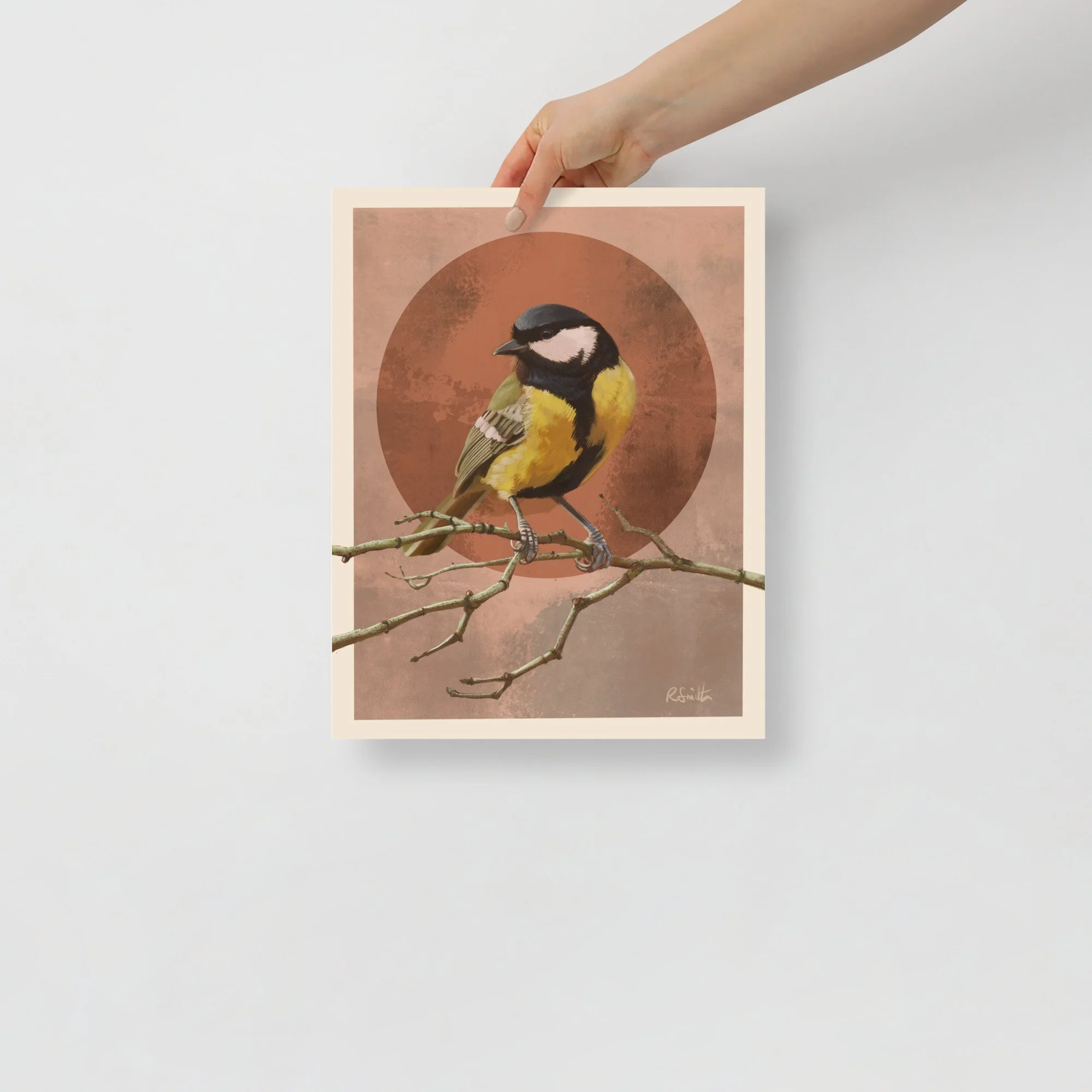 This piece depicts one of the Great Tits, perched patiently in the blossom tree, watching and waiting. It serves as a quiet reminder to pause, take a moment for yourself, and enjoy the simple wonder of nature.